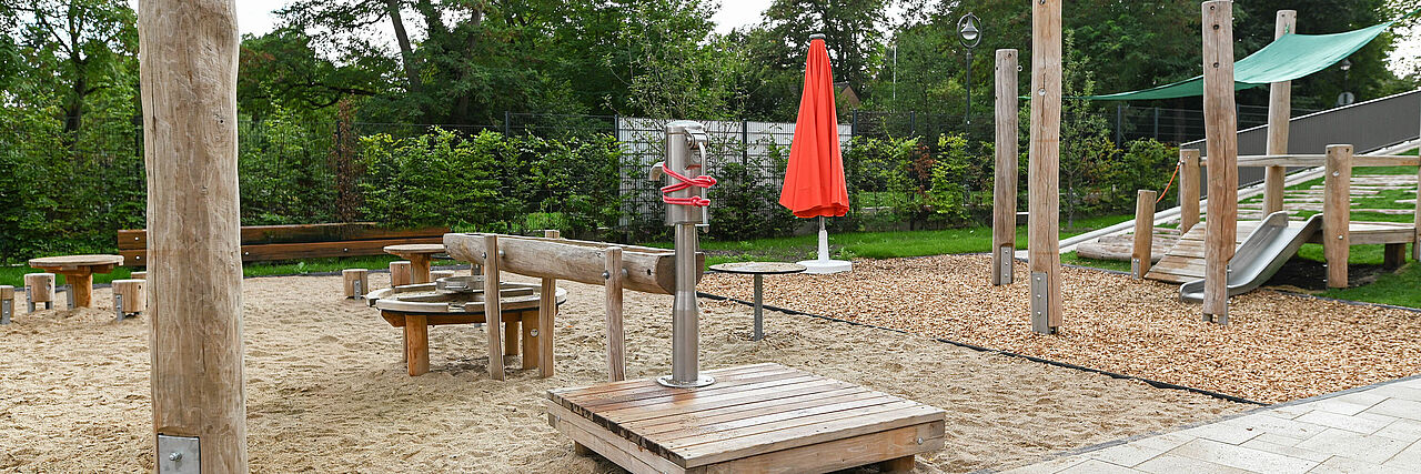 Das großzügige und attraktive Außengelände, bietet vielfältige Aktionsmöglichkeiten zum Schaukeln, Klettern, Rutschen, für Erfahrungen mit Wasser und zum Spielen. Hier haben die Kinder viele Möglichkeiten sich bei jedem Wetter frei zu entfalten und mit allen Sinnen die Natur inmitten von altem Baumbestand zu entdecken.