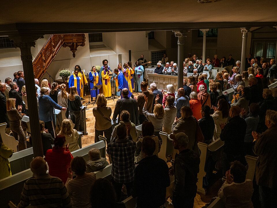 Der New Life Gospel-Chor unter der Leitung von Peter Mante gestaltete den Abend musikalisch und sorgte mit bekannten Gospelsongs für eine mitreißende Atmosphäre. Das Publikum zeigte sich begeistert – es wurde mitgesungen und mitgeklatscht. Auch zahlreiche Bewohnerinnen und Bewohner aus den DRK-Seniorenzentren Benrath und Grafental sowie Seniorinnen und Senioren des DRK-Demenznetzwerks und der Spendeninitiative Herzwerk waren der Einladung gefolgt.